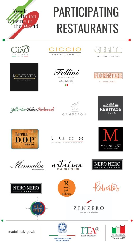 More than 26 Italian restaurants in Malaysia (list below) will take part in the event, offering special menus and programmes, including masterclasses for local chefs.