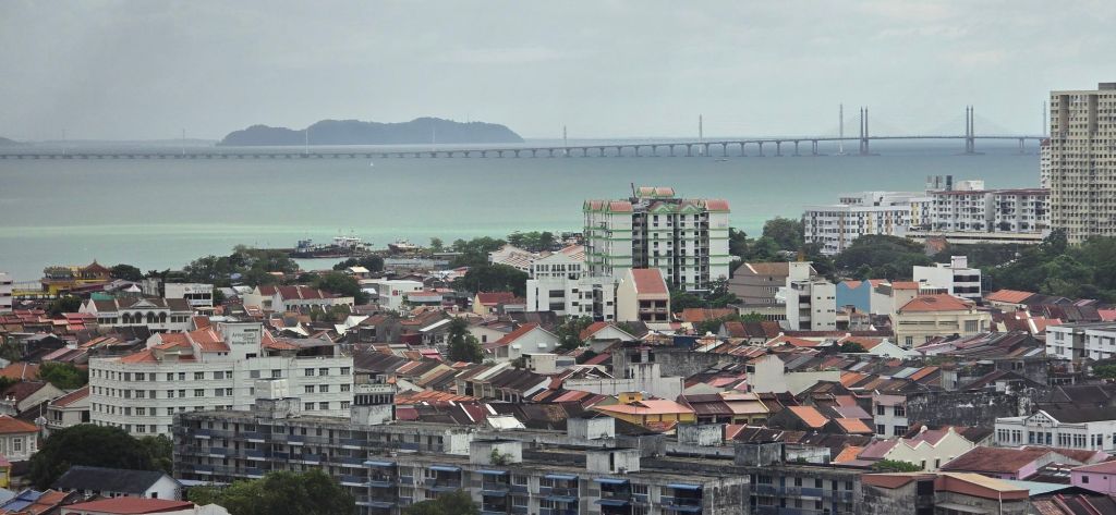 The gantry cranes of Penang port along Penang Strait are in the background, and further behind, mainland Seberang Prai or Province Wellesley is discernible.